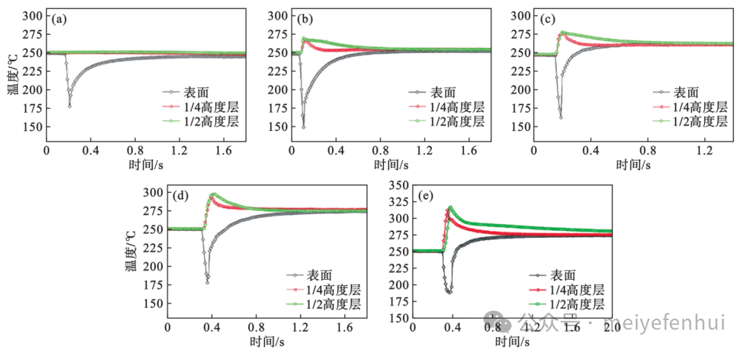 图3 AZ31B镁合金板材在不同轧制压下率下不同厚度的温度-时间变化曲线