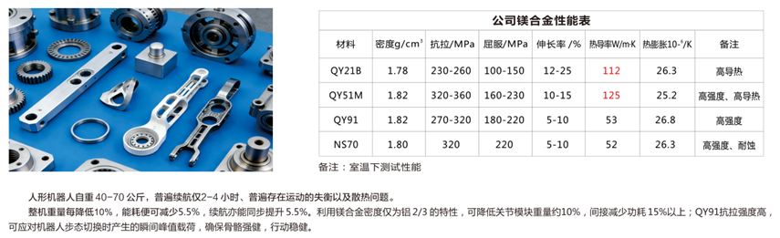 高性能镁合金凭借全方位的优势,可全面覆盖人形机器人核心部件,实现“全机身轻量化升级”,有效替代传统钢材与铝合金,推动人形机器人从实验室原型向商业化量产产品转型,真正实现“轻而强、轻而稳”。