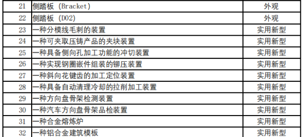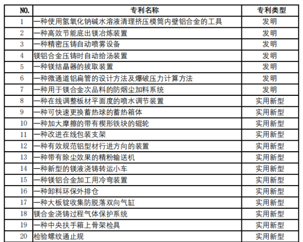 公司参与镁合金产品标准的制订,公司拥有多项专利,其中2023年新增专利33项(详见下表)。通过知识产权与参与行业标准制定,奠定了公司在业内的领军地位。
