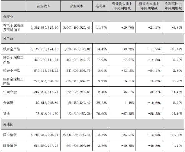 8月25日,南京云海特种金属股份有限公司(以下简称“云海金属”和“公司”)发布2023年半年度报告。2023年上半年公司实现营业收入35.33亿元,与去年同期相比下降28.85%,归属于上市公司股东的净利润1.21亿元,与去年同期相比下降75.86%。归属于上市公司股东的扣除非经常性损益的净利润为1.11亿元,与去年同期相比下降77.28%。公司与去年同期相比产品销售价格下降,毛利率下降,业绩同比下降。其中,上半年公司镁合金产品营业收入12亿元,同比下降39.22%,毛利率下降26.51%;镁合金深加工加工产品营业收入4.4亿元,同比下降7.67%,毛利率下增长5.49%。