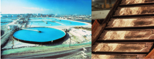 图1。陶氏在德克萨斯州Freeport的前工厂,用于从海水中分离镁的水池(左)和冷却镁牺牲阳极(右)。