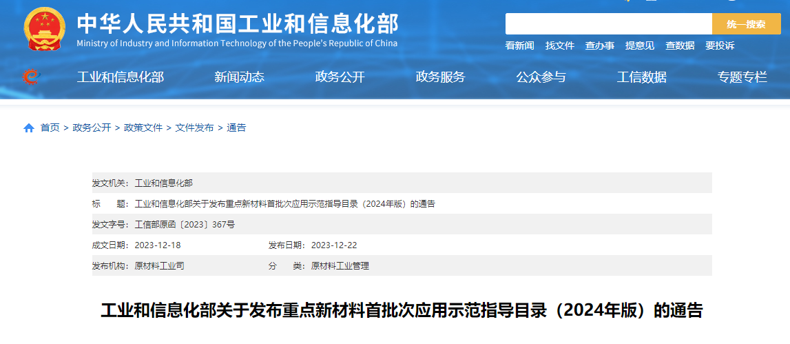 《重点新材料首批次应用示范指导目录(2024年版)》自2024年1月1日起实施。《重点新材料首批次应用示范指导目录(2021年版)》(工信部原函〔2021〕384号)同时废止。