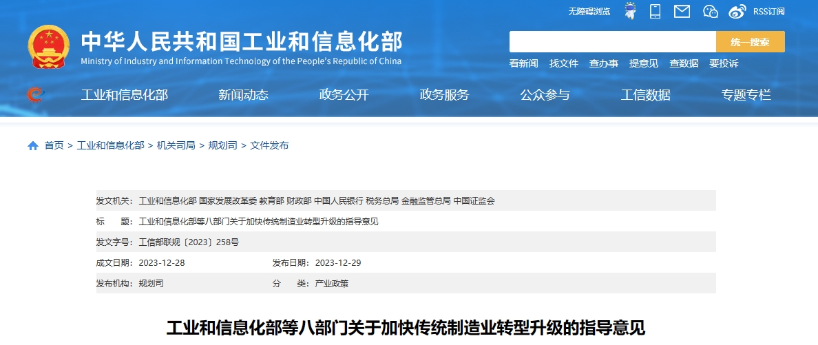 2023年12月28日,工业和信息化部等八部门发布《关于加快传统制造业转型升级的指导意见》提出,到2027年,传统制造业高端化、智能化、绿色化、融合化发展水平明显提升,有效支撑制造业比重保持基本稳定,在全球产业分工中的地位和竞争力进一步巩固增强。工业企业数字化研发设计工具普及率、关键工序数控化率分别超过90%、70%,工业能耗强度和二氧化碳排放强度持续下降,万元工业增加值用水量较2023年下降13%左右,大宗工业固体废物综合利用率超过57%。
