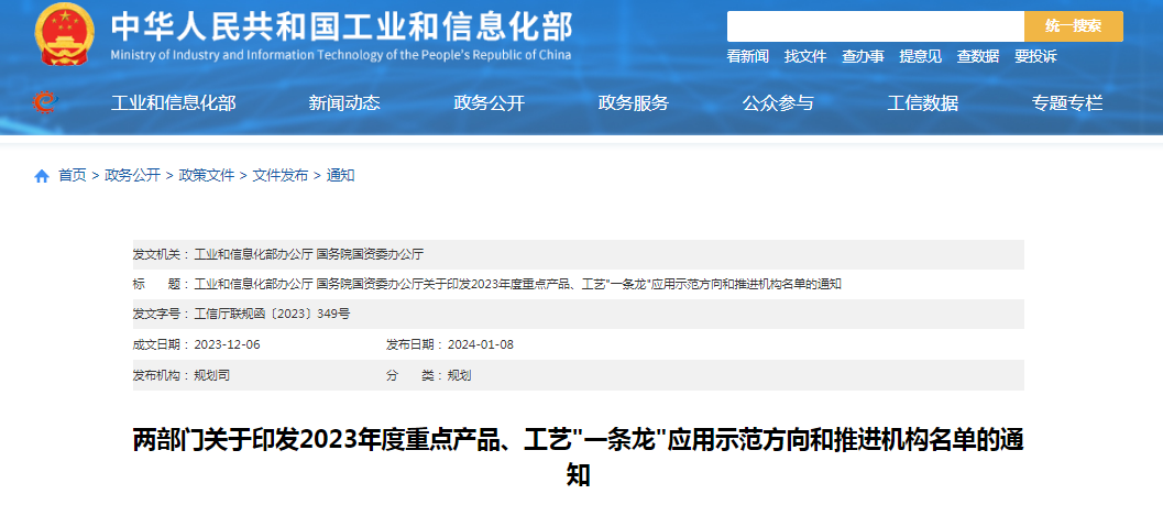 工业和信息化部办公厅 国务院国资委办公厅关于印发2023年度重点产品、工艺"一条龙"