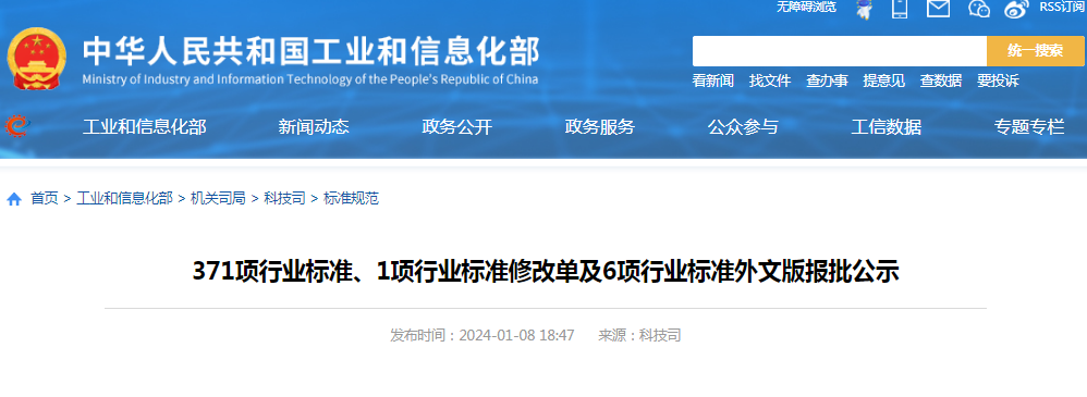 371项行业标准、1项行业标准修改单及6项行业标准外文版报批公示