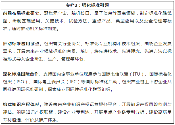 13.加强标准引领与专利护航。结合未来产业发展需求,统筹布局未来产业标准化发展路线,加快重点标准研制。针对重点标准适时开展宣贯和培训,引导企业对标达标,加速未来产业标准应用推广。促进标准、专利与技术协同发展,引导企业将自主知识产权与技术标准相融合。完善关键领域自主知识产权建设及储备机制,深化国际国内知识产权组织协作,构建未来产业高质量专利遴选、评价及推广体系。