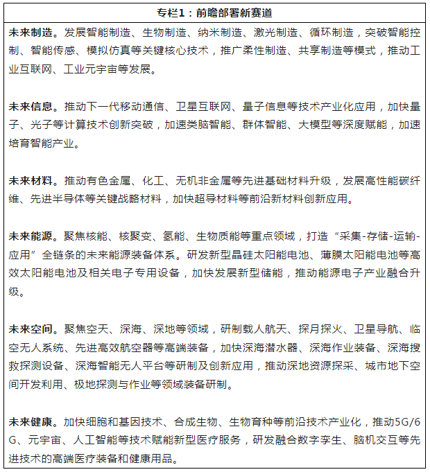 1.加强前瞻谋划部署。把握全球科技创新和产业发展趋势,重点推进未来制造、未来信息、未来材料、未来能源、未来空间和未来健康六大方向产业发展。打造未来产业瞭望站,利用人工智能、先进计算等技术精准识别和培育高潜能未来产业。发挥新型举国体制优势,引导地方结合产业基础和资源禀赋,合理规划、精准培育和错位发展未来产业。发挥前沿技术增量器作用,瞄准高端、智能和绿色等方向,加快传统产业转型升级,为建设现代化产业体系提供新动力。