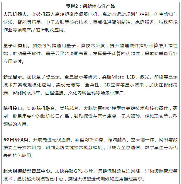 6.做强未来高端装备。面向国家重大战略需求和人民美好生活需要,加快实施重大技术装备攻关工程,突破人形机器人、量子计算机、超高速列车、下一代大飞机、绿色智能船舶、无人船艇等高端装备产品,以整机带动新技术产业化落地,打造全球领先的高端装备体系。深入实施产业基础再造工程,补齐基础元器件、基础零部件、基础材料、基础工艺和基础软件等短板,夯实未来产业发展根基。