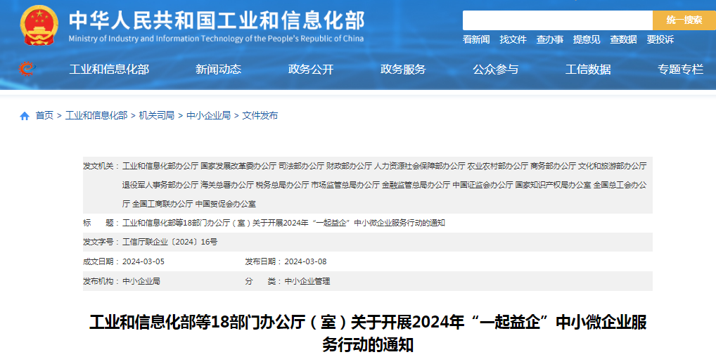 为深入贯彻党的二十大精神,落实中央经济工作会议和全国新型工业化推进大会部署,推动《关于健全中小企业公共服务体系的指导意见》重点任务落地见效,以高水平服务助力中小微企业高质量发展,工业和信息化部等18部门共同组织开展2024年“一起益企”中小微企业服务行动。有关事项通知如下: