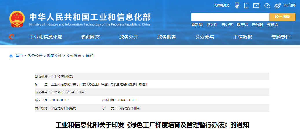 工业和信息化部关于印发《绿色工厂梯度培育及管理暂行办法》的通知