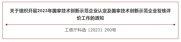 为加快实施创新驱动发展战略,强化企业科技创新主体地位,提升企业技术创新能力,根据《技术创新示范企业认定管理办法(试行)》(工信部联科〔2010〕540号,以下简称《管理办法》),现组织开展2023年国家技术创新示范企业认定及复核评价工作。有关事项通知如下: