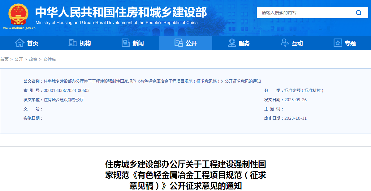 根据《住房城乡建设部关于印发2021年工程建设规范标准编制及相关工作计划的通知》(建标函〔2021〕11号),我部组织贵阳铝镁设计研究院有限公司等单位起草了工程建设强制性国家规范《有色轻金属冶金工程项目规范(征求意见稿)》(见附件)。现向社会公开征求意见。有关单位和公众可通过以下途径和方式反馈意见: