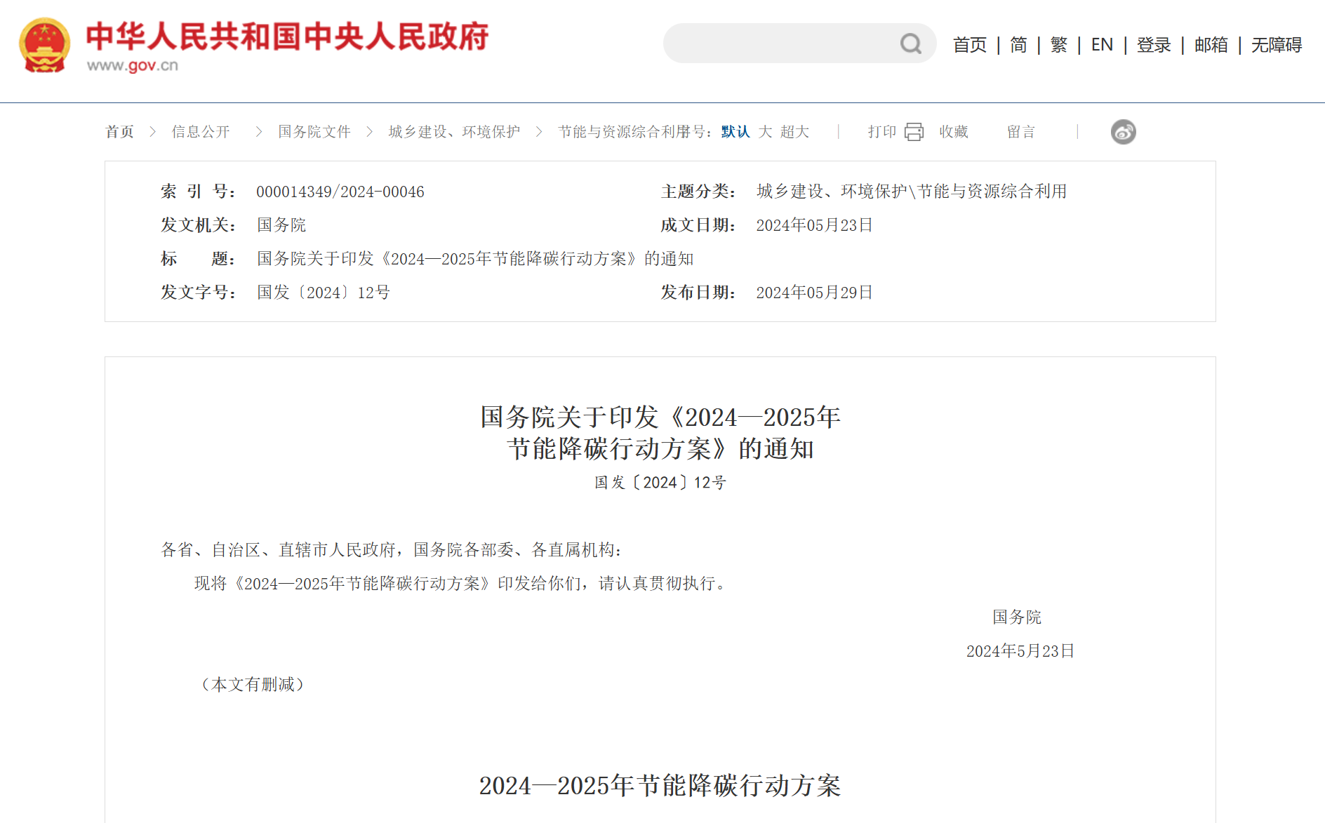 国务院关于印发《2024—2025年节能降碳行动方案》的通知