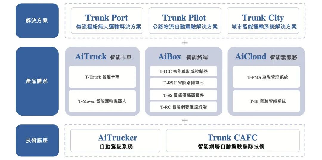 主线科技以自主研发的自动驾驶系统为核心,构建了“车-端-云”一体化的产品生态系统,为覆盖物流枢纽、公路物流及城市交通场景提供全栈解决方案,公司的解决方案包含AiTruck(智能卡车)、AiBox(智能终端)和AiCloud(智能云服务)三大核心产品,实现从物流枢纽、公路物流到城市交通的无缝连接与扩展。