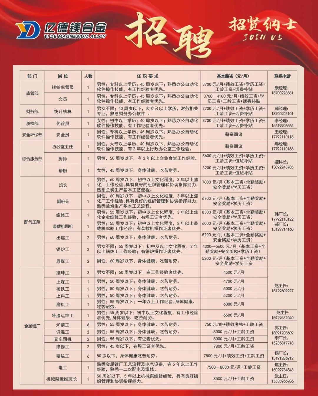 府谷县亿德镁合金有限责任公司是集金属镁、硅铁、洁净炭生产和销售的民营企业,公司位于陕西省榆林市府谷县郭家湾工业园区。现因工作需要,面向社会诚聘: