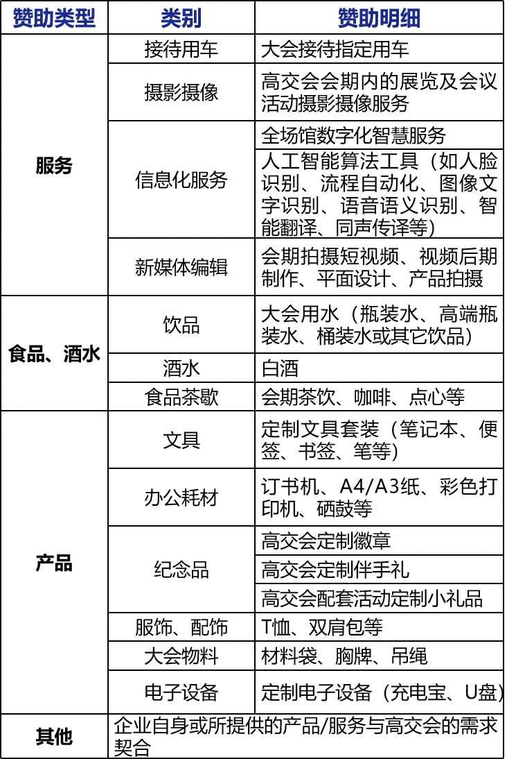 饮品、食品茶歇、文具、办公耗材、纪念品、电子设备、服装配饰、接待用车、摄影摄像、信息化服务及产品、新媒体编辑或其他与高交会需求契合度高的产品或服务。