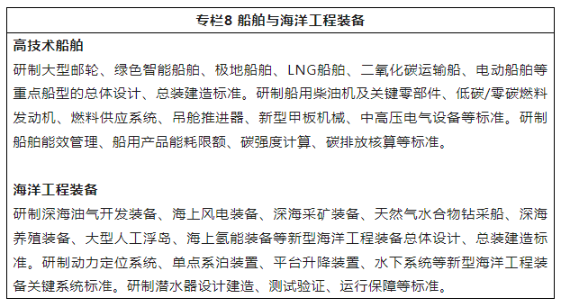 8.船舶与海洋工程装备。聚焦高技术船舶领域,研制重点船型总体设计、总装建造标准,关键零部件和系统标准,以及绿色管理标准。聚焦海洋工程装备领域,研制总体设计、总装建造、关键系统标准,研制潜水器标准。