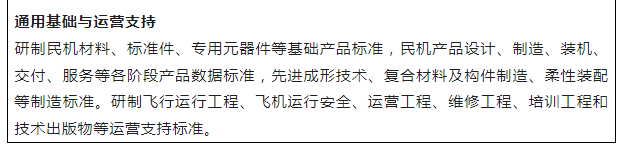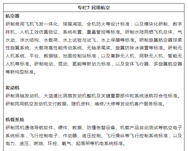 7.民用航空。研制商用飞机、水陆两栖飞机、直升机、无人机以及新动力、新构型航空器等航空器标准。研制整机、关键重要部件、适航符合性、客户服务等发动机标准。研制航空电子系统、飞行控制系统与机电系统等机载系统标准。研制基础产品、全生命周期数据、生产制造等航空通用基础标准,以及运营支持标准。