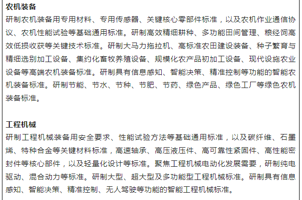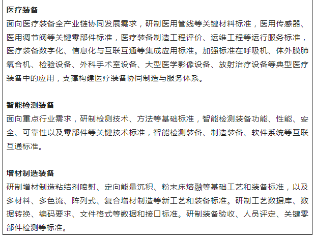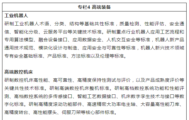 4.高端装备。研制工业机器人基础共性、关键技术和行业应用标准。研制高端数控机床关键共性技术、整机、数字化控制与核心部件标准。研制农机装备基础通用、关键技术以及高端化智能化绿色化标准。研制工程机械基础通用、关键材料、核心部件、电动化以及高端化智能化绿色化标准。研制医疗装备关键材料、核心部件、运行服务与集成应用标准。研制智能检测装备基础、关键技术和互联互通标准。研制增材制造装备核心工艺和部件、关键技术、测试评估等标准。研制装备数字化和智能制造基础共性、关键技术、典型行业应用等标准。