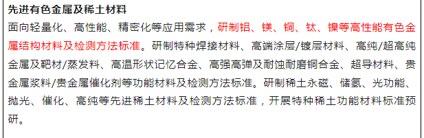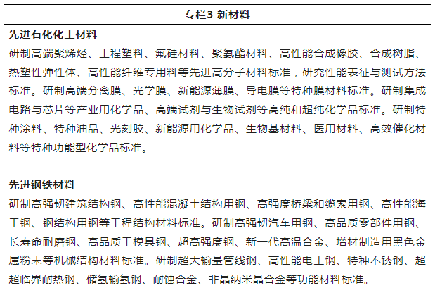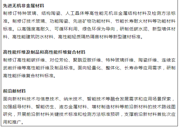 3.新材料。研制先进石化化工材料、先进钢铁材料、先进有色金属及稀土材料、先进无机非金属材料、高性能纤维及制品和高性能纤维复合材料标准。面向产业融合发展需求和应用场景探索,开展前沿新材料标准预研。