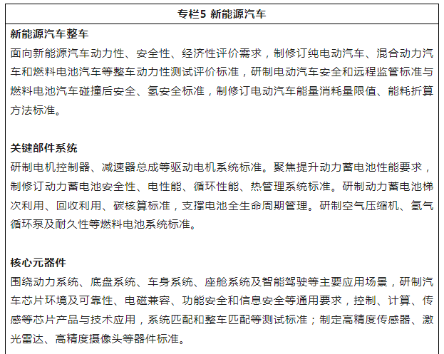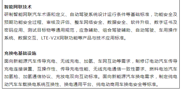 5.新能源汽车。聚焦新能源汽车领域,研制动力性测试、安全性规范、经济性评价等整车标准,驱动电机系统、动力蓄电池系统、燃料电池系统等关键部件系统标准,汽车芯片、传感器等核心元器件标准,自动驾驶系统、功能安全、信息安全等智能网联技术标准,以及传导充电、无线充电、加氢等充换电基础设施相关标准。