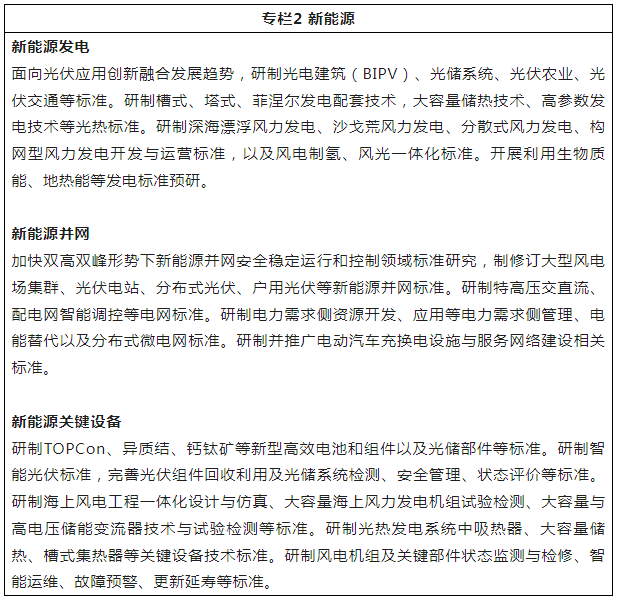 2.新能源。研制光伏发电、光热发电、风力发电等新能源发电标准,优化完善新能源并网标准,研制光储发电系统、光热发电系统、风电装备等关键设备标准。