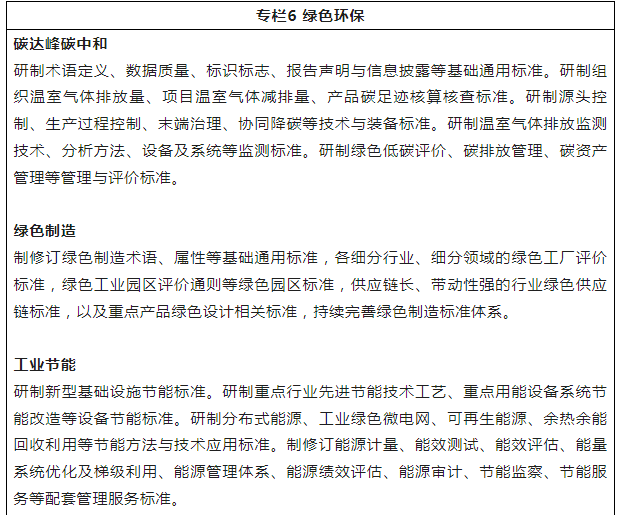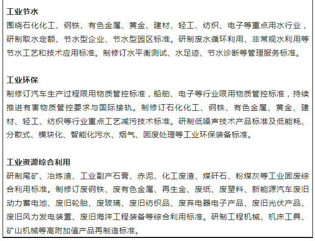 6.绿色环保。聚焦实现碳达峰碳中和目标,研制温室气体基础通用、核算核查、技术与装备、监测、管理与评价标准。优化完善绿色产品、绿色工厂、绿色工业园区和绿色供应链等标准。研制工业节能、工业节水、工业环保、工业资源综合利用等标准。