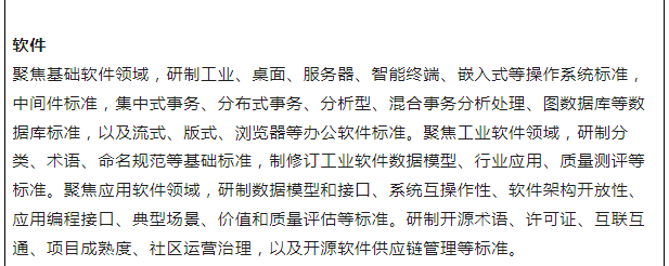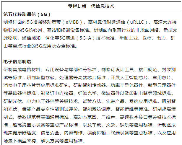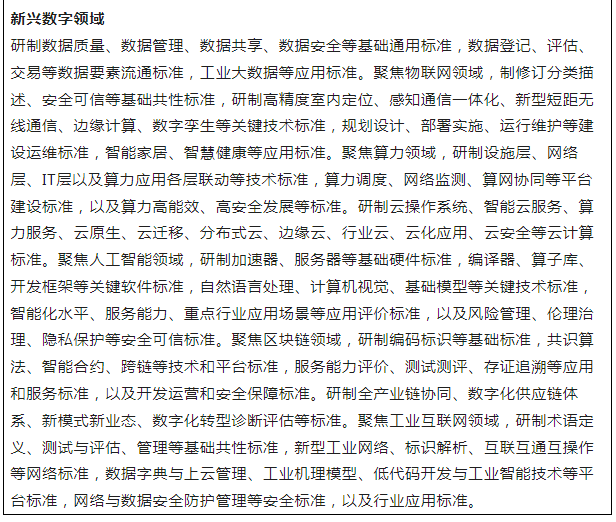1.新一代信息技术。面向重点场景和行业应用,优化完善5G标准。研制集成电路、基础器件、能源电子、超高清视频、虚拟现实等电子信息标准。研制基础软件、工业软件、应用软件等软件标准。研制大数据、物联网、算力、云计算、人工智能、区块链、工业互联网、卫星互联网等新兴数字领域标准。
